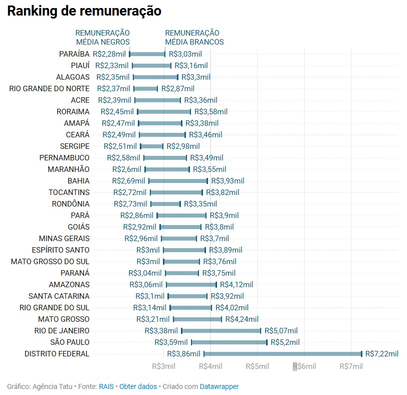 O Distrito Federal lidera a disparidade de remunerações com brancos tendo salários 86,99%  mais altos que pretos e pardos. Em seguida vem o Rio de Janeiro, com uma diferença de 49,85%, e a Bahia, com uma diferença salarial de 46,31%.